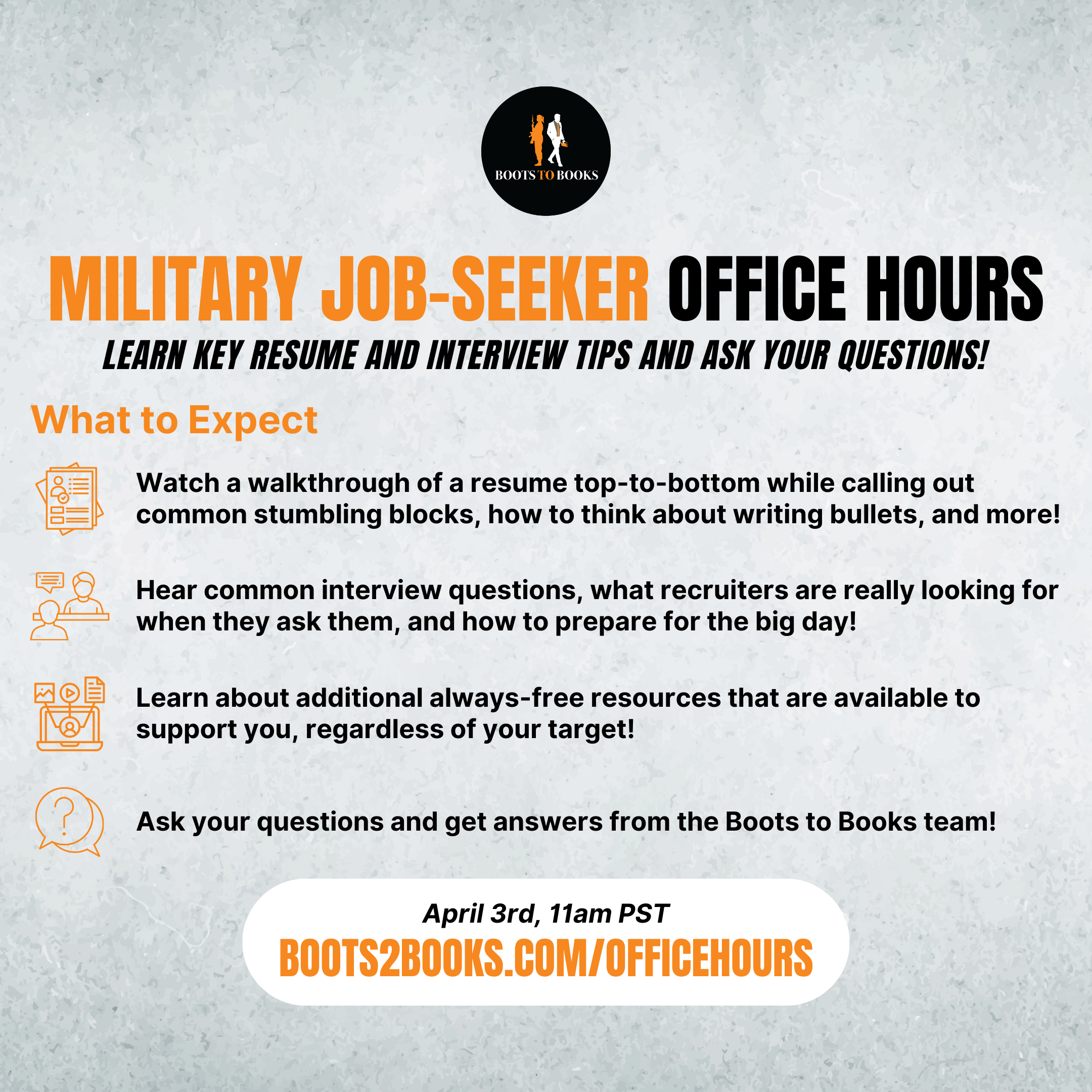 Join team Boots to Books for a deep dive on the resume. During this event, the team will go from top-to-bottom, walking through how to write an impactful bullet, how to frame your experience, and more. Plus, you'll be able to ask any job search questions you have, resume or otherwise!